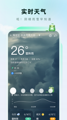 《呱呱天气》作为智能气象服务平台,依托专业气象数据源构建多维天气信息矩阵。该应用突破传统天气软件功能局限,通过智能定位技术实现公里级气象播报,支持用户多维度查看温度曲线、风力变化、降水概率等专业气象数据,独创的穿衣指数模型更结合实时温湿度数据提供着装建议。